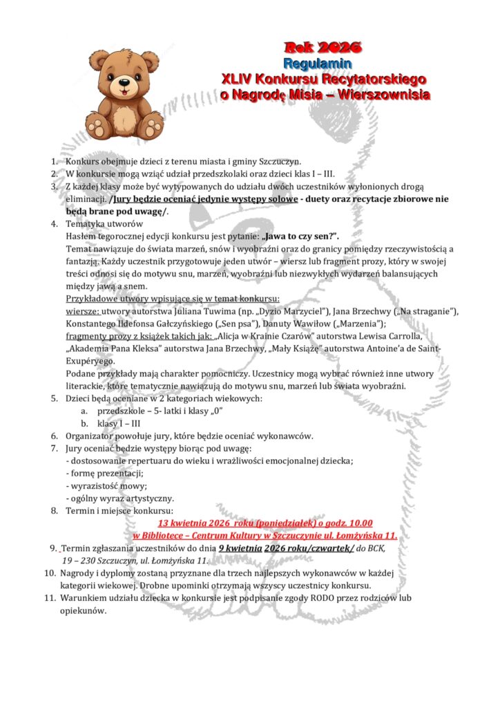 Biblioteka – Centrum Kultury w Szczuczynie zaprasza dzieci do udziału w XLIV Konkursie Recytatorskim o Nagrodę Misia – Wierszownisia!